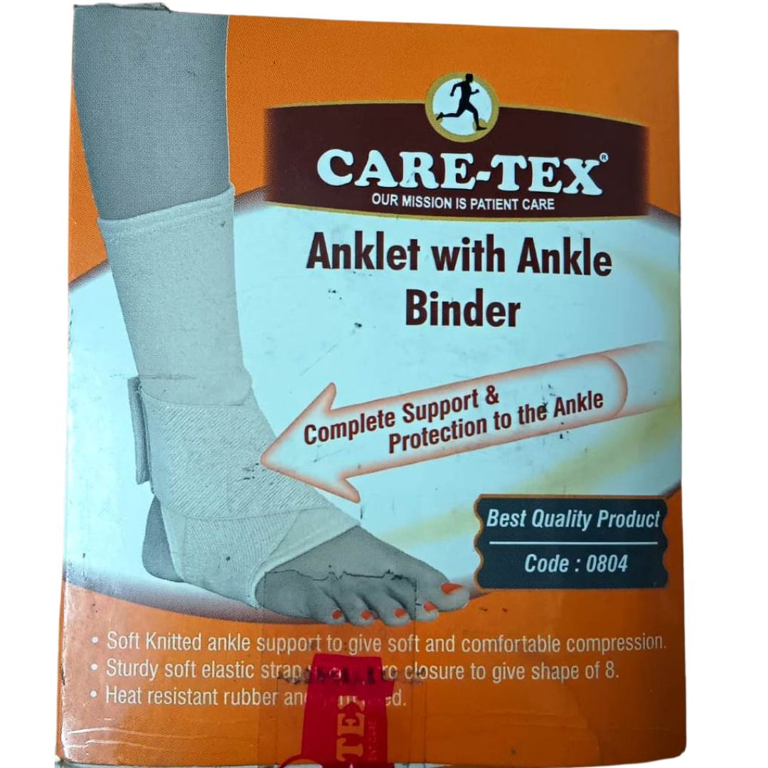 The CARE-TEX Anklet with Ankle Binder is a high-quality support designed to provide stability and compression to the ankle joint. Ideal for individuals with weak or injured ankles, this product helps reduce pain, swelling, and discomfort while promoting healing. The anklet is made from breathable, stretchable fabric, ensuring a snug yet comfortable fit. It features an adjustable ankle binder for enhanced support and customized compression, making it suitable for both athletic activities and everyday use.